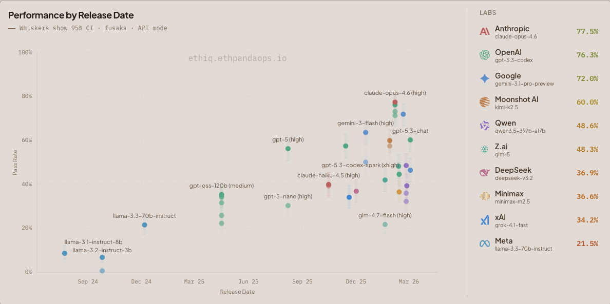 Browse the full results at ethiq.ethpandaops.io. You can filter by question category, difficulty, and evaluation mode.